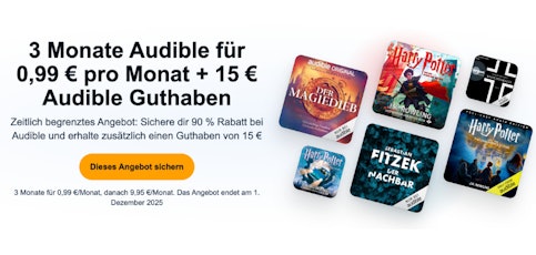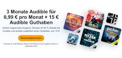 Holt euch jetzt 3 Monate Hörvergnügen für gerade einmal 0,99€ monatlich! Bei dem Preis könnt ihr wenig falsch machen - die Aktion läuft auch bis zum Dezember, sodass ihr genug Zeit habt, euer aktives Abo ggf. zu kündigen und dann zuzuschlagen. On top bekommt ihr 15€ Audible Guthaben!