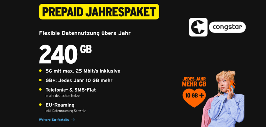 Die Handyrechnung gleich für das ganze Jahr begleichen? Könnt ihr, mit dem congstar Prepaid Jahrespaket: Euch erwarten 240GB 150GB 5G/LTE im Telekom-Netz ab monatlich 6,67€. Das Datenvolumen könnt ihr euch nach Bedarf aufteilen. Starker Deal!