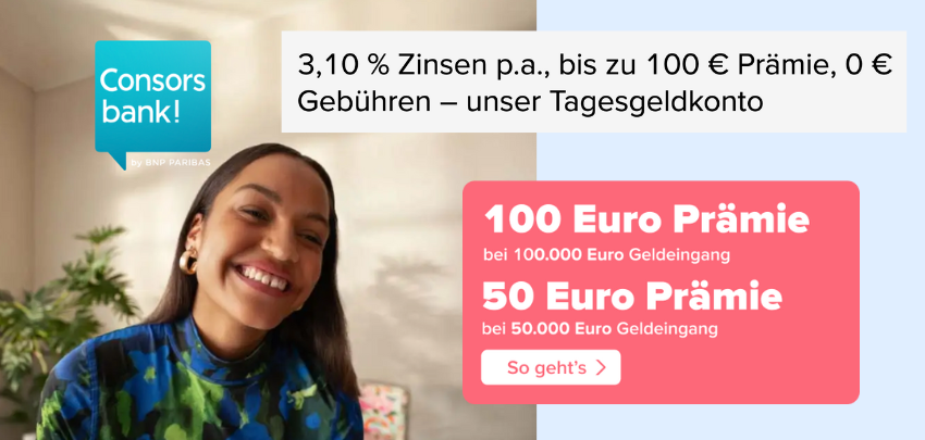Die Consorsbank legt gerade ein Top-Angebot vor, mit dem ihr euer Tagesgeldkonto besparen könnt. Es gibt 3 Monate lang 3,1% p. a. Zinsen auf bis zu 1.000.000€ Anlagevolumen.