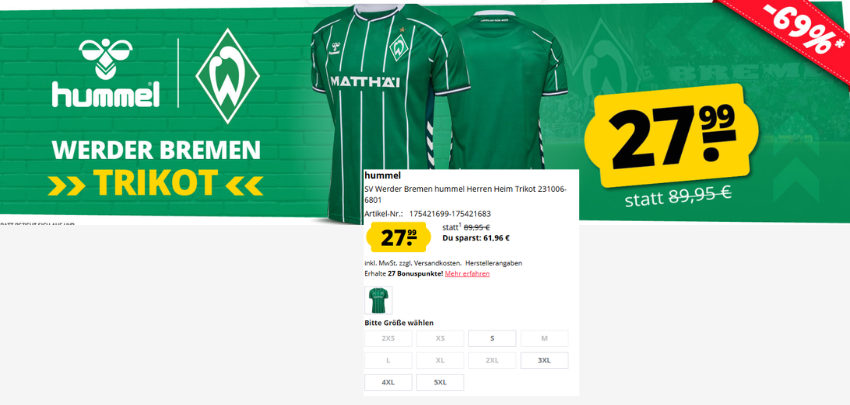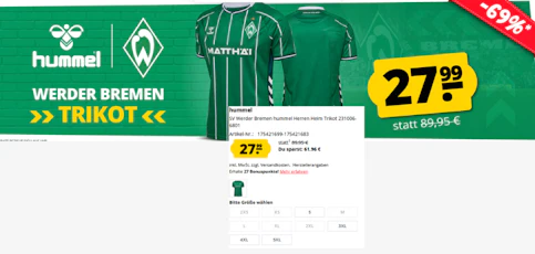 - SV Werder Bremen hummel Heim Trikot für 32,94€ inkl. Versand bei SportSpar.de (Preisvergleich: 50€)