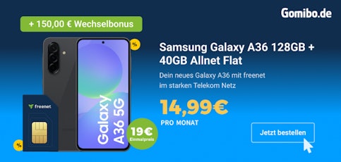- Samsung Galaxy A36 5G für einmalig 19€ mit 40GB Allnet Flat für 14,99€/Monat bei Gomibo.de