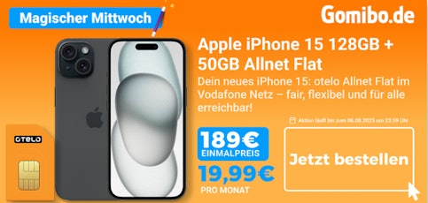 - Apple iPhone 15 für einmalig 189€ im 50GB 5G Otelo Tarif für 19,99€ mtl. bei Gomibo.de