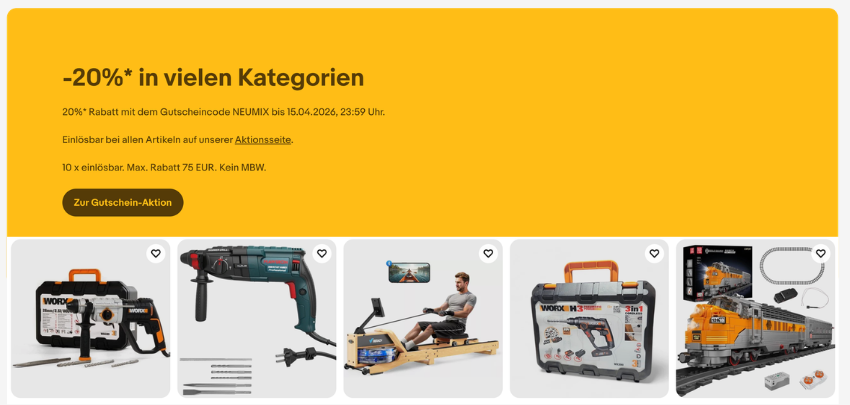 - 🔥 20% Rabatt auf ausgewählte Artikel I 🎟️ Gutscheincode: NEUMIX I💸 bis zu 75€ Rabatt möglich