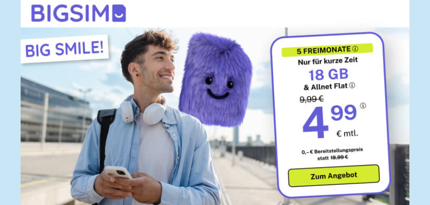 - 18GB 5G Allnet-Flat für effektiv 3,95€ mtl. bei bigsim.de