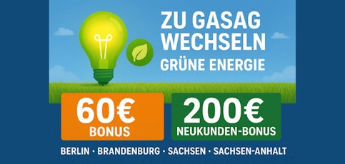 - Bis zu 200€ Neukund:innen-Bonus + 60€ Bonus für Strom- & Gastarif bei GASAG über unseren Bonusdeal