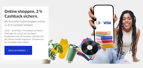 Seit ein paar Jahren gibt es diese Geld-zurück-Aktion von Visa. Bis zum 15. April 2025 bekommt ihr 2% Cashback bei Online-Zahlungen mit angemeldeter Visa Debit- oder Kreditkarte! Für jede Zahlung bis zu 50€ bekommt ihr 2% zurück - insgesamt sind maximal 25€ Cashback möglich. Klickt euch einfach rüber zur Aktionsseite und registriert eure Karte, der Rest geschieht ganz automatisch.