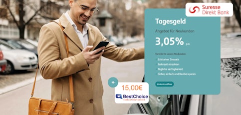 - Suresse Bank Tagesgeldkonto mit 3,05% Zinsen p.a. + 15€ Bonus über unsere Bonus-Deals