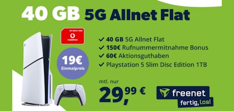 Steht noch keine PlayStation 5 bei euch Zuhause? Das könnt ihr jetzt ändern! Bei Freenet gibt es die PS5 Slim in der Disc Edition zusammen mit einer 40GB Vodafone-Flat inkl. 5G zu top Konditionen. Viel Spaß damit!