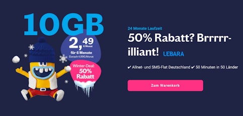 Mit dem Lebara Allnet-Tarif surft ihr monatlich mit 10 GB Datenvolumen und profitiert von einer Allnet- & SMS-Flat. Darüber hinaus stehen euch jeden Monat 50 Freiminuten in 50 Länder innerhalb und außerhalb der EU zur Verfügung. Doch das Beste: Ihr erhaltet die ersten 6 Monate satte 50% Rabatt auf die monatliche Grundgebühr!
