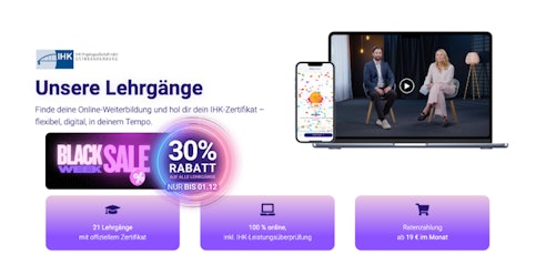 Bei The Key Academy erhaltet ihr 30% Rabatt auf Online-Lehrgänge mit IHK-Zertifikat. Sichert euch diese attraktive Ersparnis und startet eure berufliche Weiterbildung!