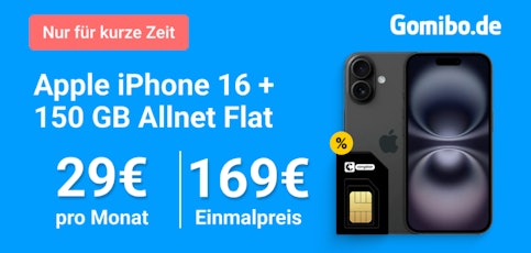 - Apple iPhone 16 im 150GB Congstar-Tarif für 29€ mtl. bei Gomibo.de