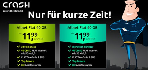 - Highlights: 40GB 5G/LTE | Allnet- & SMS-Flat | EU-Roaming | 0€ Anschlusspreis | Vertragsbeginn flexibel