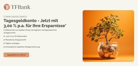 Die Tagesgeld-Zinsen bei der schwedischen TF Bank sind die höchsten, die ihr momentan am Zinsmarkt bekommt! Hier könnt ihr euer Angespartes 3 Monate lang zu einem garantierten Zinssatz von 3,00% p. a. bei monatlicher Zinsgutschrift vermehren. Danach fällt der Zinssatz regulär auf 1,45% p.a.