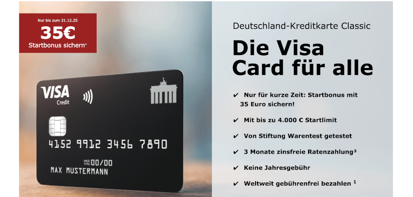 Nachdem eine Bank nach der anderen für die Visa-Karten und deren Auslandseinsatz Gebühren verlangt, ist die Anzahl an wirklich kostenlosen Kreditkarten deutlich geschrumpft. Eine Ausnahme gibt es aber noch, die sich auch perfekt für Reisen anbietet (da keine Fremdwährungs- oder Bargeldabhebungsgebühren anfallen): Die Deutschland-Kreditkarte Classic, und die gibt es jetzt sogar mit 35€ Werbeprämie.