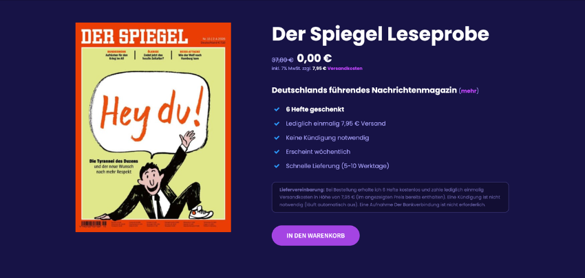 Für alle, die es noch nicht kennen und sich eine Meinung bilden wollen: Habt ihr Lust, das größte und beliebteste Nachrichten-Magazin Deutschlands Probe zu lesen? Aktuell ist es im Angebot der Seite Aboheld, bei der ihr 6 Zeitschriften zum Preis der Versandkosten bekommt. Es handelt sich nicht um ein Abonnement und verlängert sich nach Erhalt der 6 Hefte nicht. Ein guter Deal also für die Vergesslichen unter uns. Viel Spaß damit!