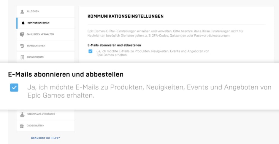 An den Gutschein kommt ihr ganz einfach. Habt ihr den Newsletter von Epic Games schon abonniert, sollte der Gutschein bereits in eurem Konto-Inventar auf euch warten. Wenn ihr den Newsletter noch nicht kennt, könnt ihr euch in eurem Konto unter ‚Kommunikationseinstellungen‘ dafür anmelden. Es kann dann bis zu 24 Stunden dauern, bis der Gutschein in eurem Konto-Inventar eintrudelt.