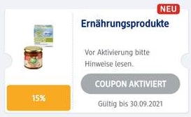Coupon gilt für beliebig viele Ernährungsprodukte innerhalb eines Einkaufs. Ausgeschlossen ist Baby- und Kindernahrung. Coupon einlösbar in dm-Märkten in Deutschland und bei Bestellungen auf dm.de oder über die Mein dm-App. Gültig bis 30.09.2021.