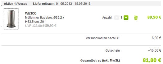Wesco-Mülleimer gabs auch vor geraumer Zeit bei Westwing, da habe ich mir einen gegönnt. Leider wurde dieser verbeult geliefert, und da es sich um Aktionsware handelte war es Westwing nicht möglich mir Ersatz zu liefern. Da haben sie mir das Geld zurücküberwiesen mit dem Hinweis, ich möge den Eimer doch bitte selbst entsorgen...
