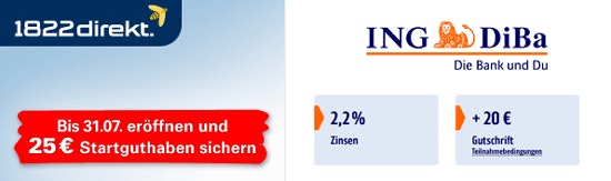 1822direkt Tagesgeld mit 25€ Startguthaben (ab 10.000€) / ING-Diba mit 20€ Startguthaben (ab 5.000€)