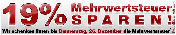 Sorry, aber dieses Angebot beleidigt jeden Menschen mit Intellekt. Was hier gespart wird, ist ganz bestimmt nicht der Betrag der Mehrwertsteuer. Die Rechnung geht wie folgt: x sei der Nettopreis des Artikels. Dann beträgt der ursprüngliche Verkaufspreis des Artikels 1.19*x (19% Mehrwertsteuer). Werden nun vom Verkaufspreis 19% abgezogen, kommen wir auf den Preis x' = 1.19*x - 1.19*x*0.19 = 0,9639*x. Der Verkaufspreis liegt also noch 3,61% unter dem Nettopreis.