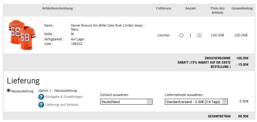 Alle Preise im Shop sind bereits mit den 20% Rabatt abgerechnet. Zusätzlich könnt ihr euch noch die 15% Rabatt über den Newsletter holen – wie das geht, erklären wir unten. Im Shop könnt ihr euch dann nach Herzenslust austoben bei den verschiedenen Teams. Es gibt die Originaljerseys, Helme oder auch einfach ein paar Fanshirts.