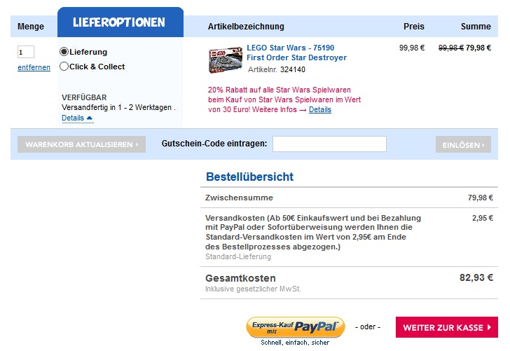 Kleiner Tipp an dieser Stelle: Wenn ihr über 50€ Warenkorbwert kommt und per PayPal oder Sofortüberweisung zahlt, dann entfallen die Versandkosten. Bei den Beispielen oben könnt ihr euch also die sonst anfallenden 2,95€ sparen. Anbei noch ein Screenshot aus dem Warenkorb.