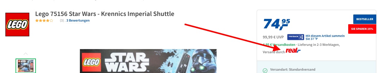 Mittlerweile ist Real.de nicht mehr nur der Online-Shop der Warenhandels-Kette. Durch den Kauf von Hitmeister bietet man nun einen Marktplatz und damit Platz für zahlreiche eigenständige Händler. Wer hier die Lego-Schnäppchen mit Rabatt abstauben will, der sollte daher darauf achten, dass Real auch der Verkäufer ist. Sonst gibt es keinen Rabatt mit dem Gutscheincode 20-prozent-auf-lego. Leider legt Real momentan nicht so viel Wert darauf, dass man hier schnell ein Angebot und den Anbieter unterscheiden kann und so auch problemlos den Gutschein anwenden kann. Aber das ist Amazon ja auch egal.