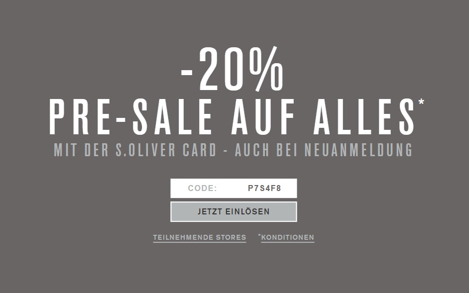 Bei s.Oliver könnt ihr aktuell bis zu 20% Rabatt ergattern. Alle Kunden erhalten 10% Rabatt und s.Oliver Card Kunden (Neu- und Bestandskunden) erhalten 20% Rabatt mit dem Gutscheincode P7S4F8. Das Angebot gilt bis zum 10.12.2017
