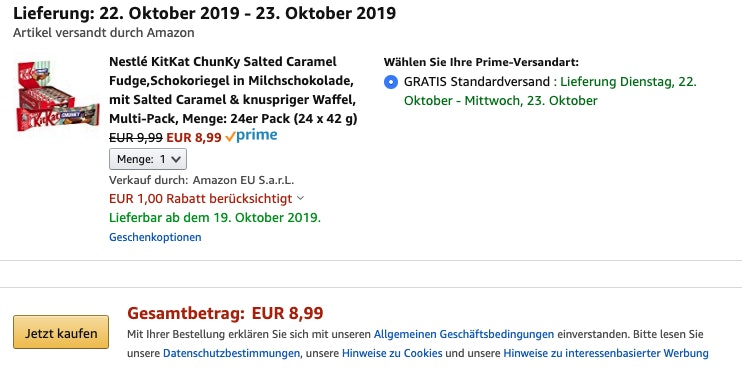 Wichtig für den Preis ist, dass ihr für den Aktionspreis den 10%-Coupon aktiviert. Im Warenkorb wird dann der reduzierte Preis berücksichtigt. Bei allem Appetit gilt es allerdings etwas Geduld zu haben. Amazon will ab dem 19. Oktober ausliefern.