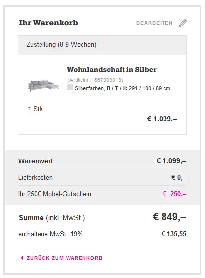So funktioniert es: Artikel in den Warenkorb legen und den Gutscheincode Möbel1000k in der Bestellübersicht einlösen. Gültig bis 24.11.2018 bei Kauf von Möbelstücken Ihrer Wahl. Ausgenommen reduzierte sowie in unseren aktuellen Prospekten oder Anzeigen beworbene Ware, die im Haus gekennzeichnet ist. Bei Inanspruchnahme können keine weiteren Rabatte gewährt werden. Nicht gültig auf bereits getätigte Aufträge und bei Kauf von Produkten der Marke based. Keine Barauszahlung möglich.