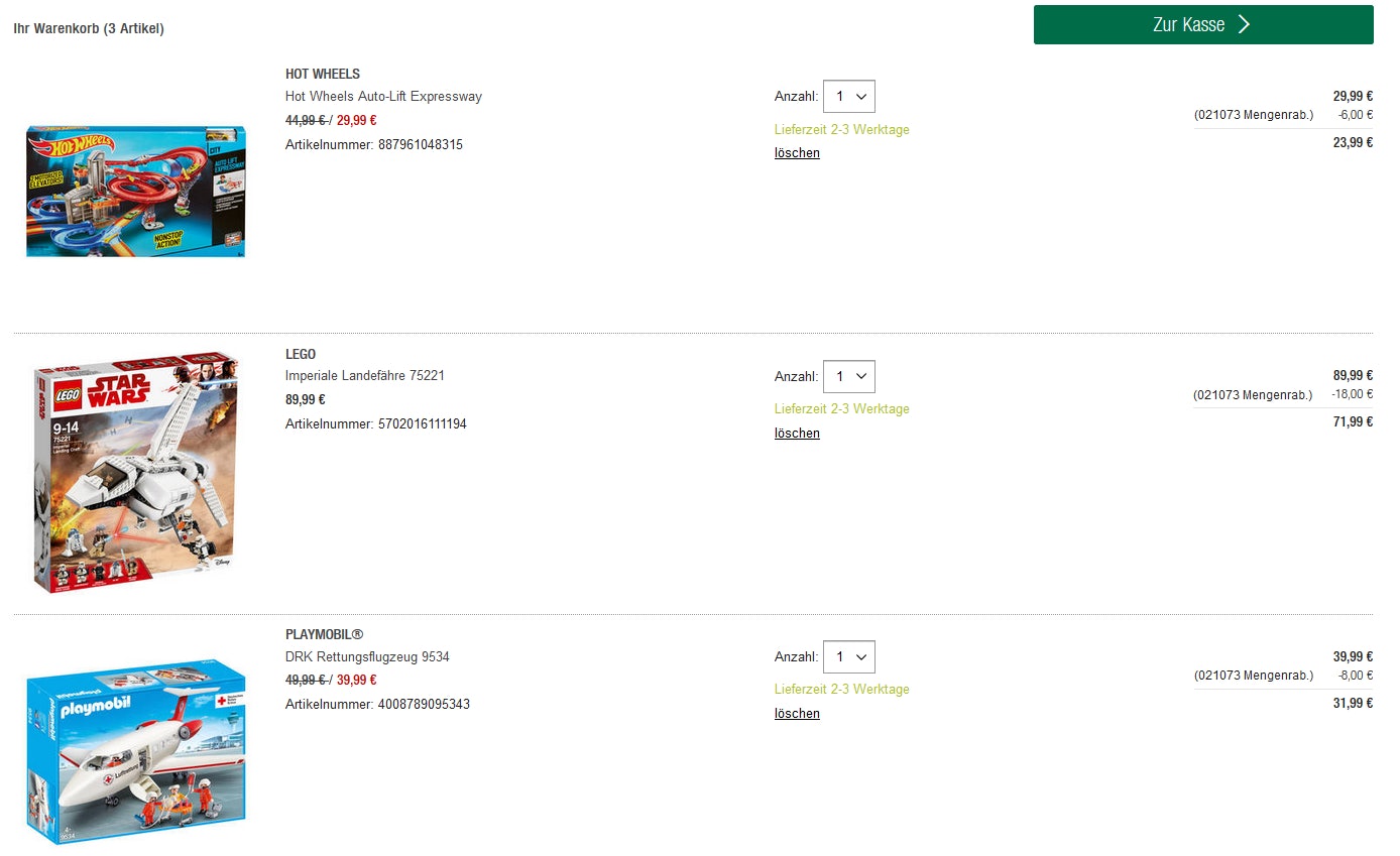 Das Angebot ist sowohl online als auch offline erhältlich, Versandkosten fallen ab 49€ keine mehr an, andernfalls müsstet ihr 3,95€ blechen. Anbei noch ein Screenshot aus dem Warenkorb für die oben genannten Produkte.