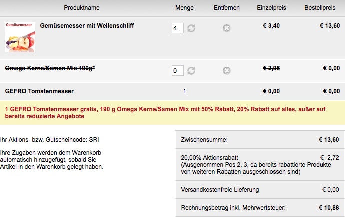 Gefro hat mal wieder einen ordentlichen Gutschein ausgepackt. Mit diesem bekommt ihr 20% Rabatt und zusätzliche Goodies. So gibt es 4 Gemüsemesser, 1 Tomatenmesser und den Kerne/Samen Mix schon für unter 11€. Gut möglich, dass der Rabatt auch bei Bestandskunden funktioniert. Einen Versuch ist es wert.