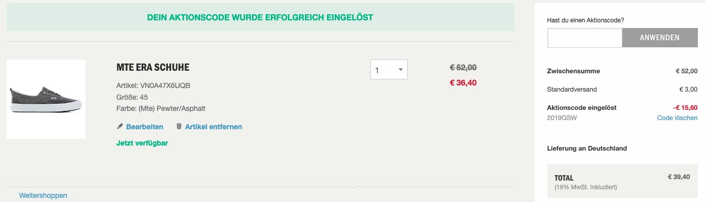 Beachtet bitte, dass die Versandkosten erst ab 50€ Bestellwert (nach Abzug des Gutscheincodes) kostenlos sind. Andernfalls müsst ihr noch 3€ Versand blechen. Wer kurz vor den 50€ steht, sollte vielleicht überlegen, noch einen Füllartikel wie z.B. Socken in den Warenkorb zu packen. Das lohnt sich mehr als die Kosten für den Versand zu zahlen. 😉