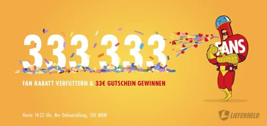 Lieferheld hat heute 333333 Fans auf Facebook erreicht und bedankt sich bei allen Facebookfans dafür mit einem 3,33 Gutschein bei 10 Mindestbestellwert: