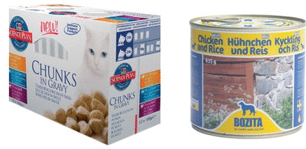 Für Hunde habe ich auch was gefunden. Ich meine mich an Bozita als gutes Hundefutter zu erinnern. Bei Zooplus bekommt das Futter 5 Sterne: