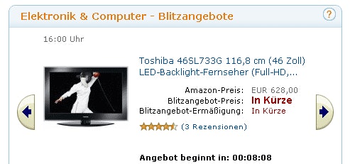 Update am 12.05.11: Ab 16 Uhr gibt es den 46SL733G als Blitzangebot. Wenn es ein guter Preis ist, wird in 1 Minute wieder alles weg sein – so wie gestern. Also am besten Punkt 16 Uhr bei Amazon sein, in den Warenkorb legen und nochmal tief durchatmen. Bis 23:59 Uhr hat man dann Zeit.