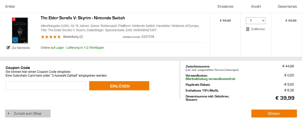 Die Aktion ist denkbar einfach – ihr müsst während der Bestellung der Aktionsprodukte einfach nur paydirekt als Zahlmethode auswählen und das bestätigen, danach werden euch die 5€ automatisch abgezogen, wie ihr unten im Bild sehen könnt. An der Aktion nehmen alle Games, Film & Musikartikel teil, die bis einschließlich 16.12.2017 veröffentlicht wurden. Die Einlösungen scheinen nicht begrenzt zu sein, ihr könnt also auch mehrere Bestellungen durchführen. Pro Bestellung wird der Rabatt allerdings nur 1x gewährt.
