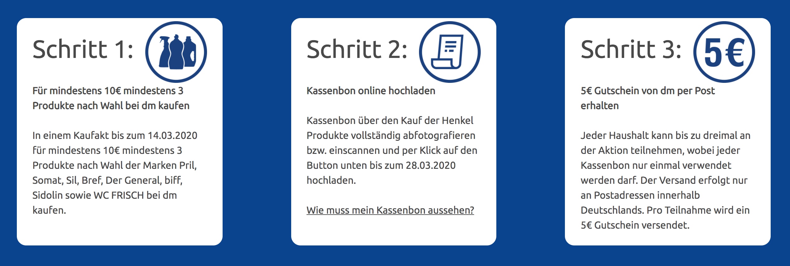 Bei eurem nächsten Einkauf im dm-Markt packt ihr euch mindestens drei Henkel-Produkte in euren Einkaufswagen, die eine Summe von mindestens 10€ ergeben. Darunter fallen viele Produkte des täglichen Bedarfs – z.B. Geschirrspültabs, Glasreiniger, Spülmittel uvm. Anschließend ladet ihr den Kassenbon bis zum 28.03.2020 auf der Henkel-Seite hoch und der Gutschein wird euch so schnell wie möglich per Post nach Hause geschickt.