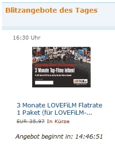 [/update][update datum=2]In einer halben Stunde geht es bei den Blitzangeboten und dem Lovefilm 3 Monats Paket los. Zum Glück steht der reguläre Preis immer noch bei 35,97, der Versand ist also kostenlos (auch wenn das Blitzangebot nachher unter 20 liegt!) Bei Groupon gibt es wohl aktuell Probleme mit dem Bestellprozess, aber ich denke, das wird nachher behoben.[/update]
