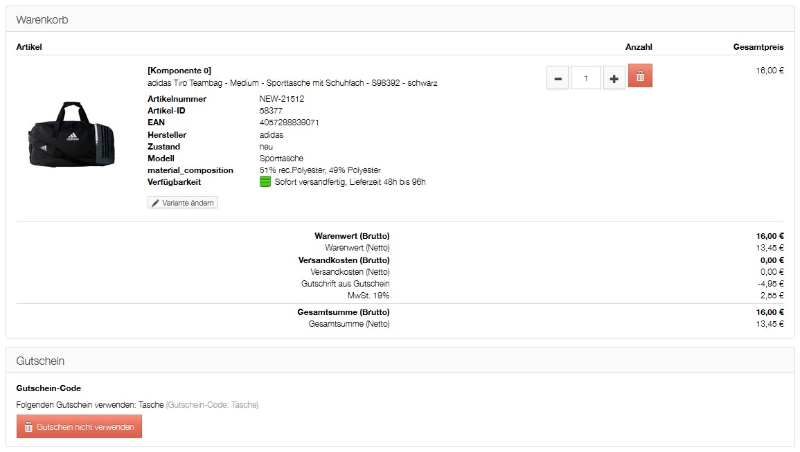 Auf den genannten Preis kommt ihr durch den Gutscheincode „Tasche“, den ihr einfach im Warenkorb eingeben könnt. Dadurch egalisieren sich die Versandkosten auf 0€. Andere Farben der Tasche stehen ebenfalls zur Auswahl, sind allerdings teurer. Im Warenkorb sieht das ganze dann wie folgt aus:
