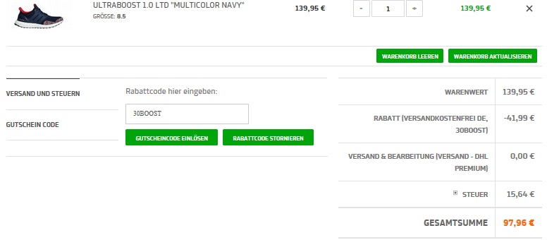 Sneaker in den Warenkorb, Gutschein-Code 30BOOST eingeben und ab geht die wilde Preisreduzierungsfahrt. Ihr kennt das ja. 🙂