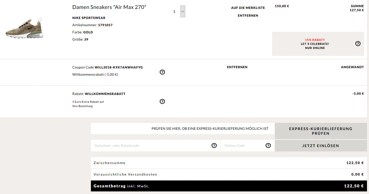 - Nike Air Max 270 für 122,50€ inkl. Versand (Preisvergleich: 150€)