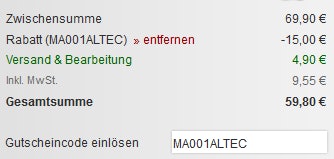 Schreiben Kommentar schreibenalso... was mich hier stört ist die angabe des preisvergleich-wert von 95 EUR! das stimmt einfach nicht, da der gleiche anbieter ohne gutschein-code die ware für 69,90 plus Versand anbietet. ob ich jetzt sein schnäppchen mit 15 EUR weniger oder 35 EUR weniger mache ist da dann doch ein großer Unterschied. by the way: ich hab mir das teil bestellt! :-) Es ist ja ein guter Preis... nur der Preisvergleich hinkt! ok?