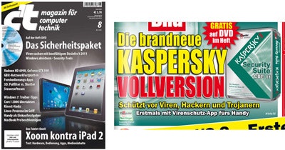Die Ausgabe 8/2011 der c’t kann noch bestellt werden und wird für 3,70 versandkostenfrei geliefert. Auch hier sind 1 Jahr Updates enthalten. AV Comparatives (PDF) nennt ESET die beste Software aus dem Vergleich, die keinen Award gewonnen hat. Positiv im Vergleich zu Kaspersky ist vor allem die bessere Performance. Dadurch sind die meisten damit deutlich zufriedener, auch wenn es weniger Funktionen hat als Kaspersky. Bisher sind es nur 2 Rezensionen (5 Sterne).
