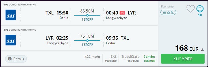 Es stehen mehrere Flugtage zum günstigen Preis bereit. Aus Berlin fliegt ihr bereits ab 168€ hin und zurück, ab Frankfurt ab 232€. Bei der SAS könnt ihr dann auch euer Aufgabegepäck bis zu 23 kg mitnehmen. Nachfolgend sind einige Ab- und Rückflugtage zum guten Preis aufgeführt. Ihr werdet auf jeden Fall noch mehr finden. Bei einigen Zwischenstopps könnt ihr sogar ein paar Stunden in Oslo oder Kopenhagen rausschlagen und so die Hauptstadt Norwegens oder Dänemarks besuchen. Bei dem 1. Beispiel handelt es sich um sehr kurze Stopps, bei unteren Screenshot aus Frankfurt seid ihr über Nacht in Oslo.