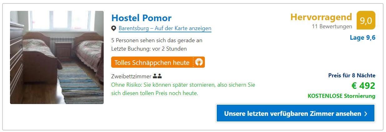 In Svalbard werdet ihr sowohl Hotel als auch Privatunterkünfte, z.B. auf Airbnb oder bei einem Hotel auf der Hotelvergleichsseite booking.com und hotelscombined.com, vorfinden. Ganz klar, in Norwegen sind die Übernachtungen teurer, aber auch hier lassen sich gute Angebote finden. Über Booking.com bucht ihr zum Beispiel für 8 Nächte (am Beispiel 10. – 18. Juli aus Berlin) ein Zweibettzimmer im Hostel Pomor in Barentsberg für 492€ für alle Nächte für zwei Personen, demnach sínd es 246€ pro Kopf. Das Hotel hat hervorragende Bewertungen mit Zugang zum Gemeinschaftsbad.