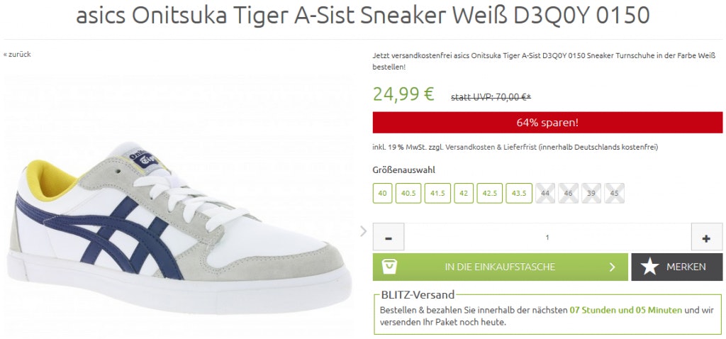 - Asics Onitsuka Tiger A-Sist für 24,99€ inkl. Versand bei Outlet46.de (Preisvergleich: 35€)