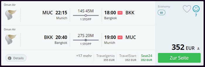 - Abflughafen: München mit Oman Air und 30 kg Freigepäck, weitere Abflughäfen mit anderen Airlines