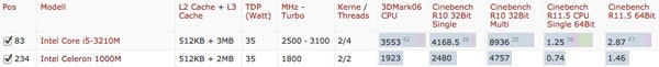 Vergleicht man den Intel Celeron 1000M mit einer Standard-CPU (z.B. Core i5-3210M), dann sieht man, dass der Prozessor rund halb so schnell/langsam ist: