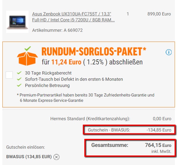 Mit 8GB RAM und 256GB SSD und einem Intel Core i5-7200U Prozessor liefert das Zenbook schon mal ein solides Fundament. Das Display ist entspiegelt und kommt mit Full-HD daher. Selbstverständlich! 🙂 Den Arbeitsspeicher könnt ihr übrigens auf maximal 16GB erweitern. Damit ihr auf den Preis kommt, müsst ihr den Gutschein BWASUS im Ende des Bestellvorgangs im Warenkorb einlösen. Wie das ganze dann aussieht seht ihr auf dem Screenshot.